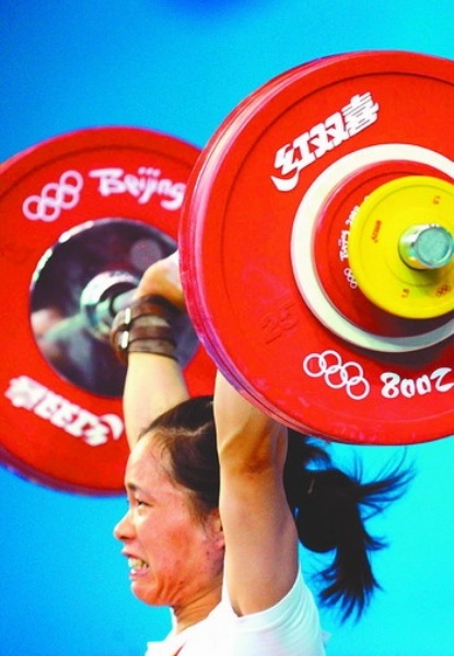 8月11日下午,中国选手陈艳青在北京奥运会举重女子58公斤级决赛中,以总成绩244公斤成功卫冕,并打破该项目挺举和总成绩两项奥运会纪录。 本报记者 李景录摄