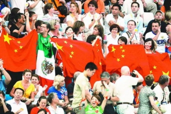 8月11日下午,在国家游泳中心,游泳、跳水比赛好戏连台。热情的观众为运动员加油喝彩。 本报记者 李景录摄