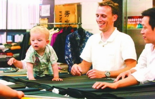 8月11日,北京前门商业街老字号瑞蚨祥丝绸店里,一个外国儿童趴在柔软的丝绸上。北京奥运会开幕以来,中华老字号商品备受外国游客青睐。 本报记者 乔金亮摄