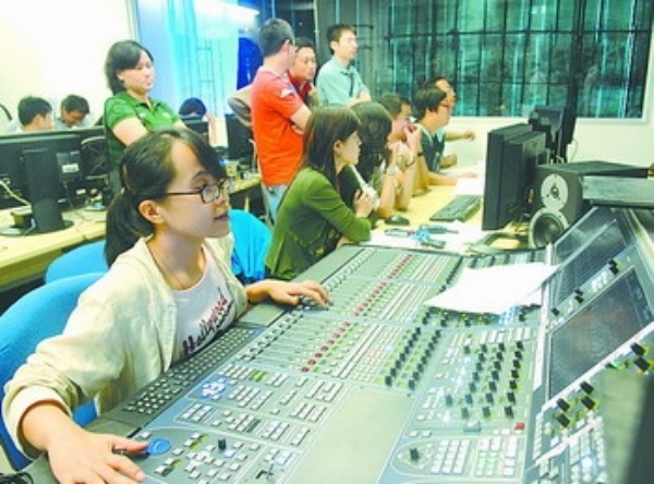 位于北京市东三环的央视新址大楼,是集指挥、制作、播出为一体的报道中心,全部采用高清网络制播系统。奥运期间,这里的工作人员超过1000人,共投入7个频道,转播全部28个比赛项目,节目播出总量将接近3000小时。 本报记者 赵 晶摄
