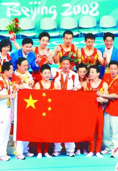 8月12日,在国家体育馆举行的北京奥运会体操男子团体决赛中,中国队以286.125分的成绩获得冠军。 本报记者 李景录摄