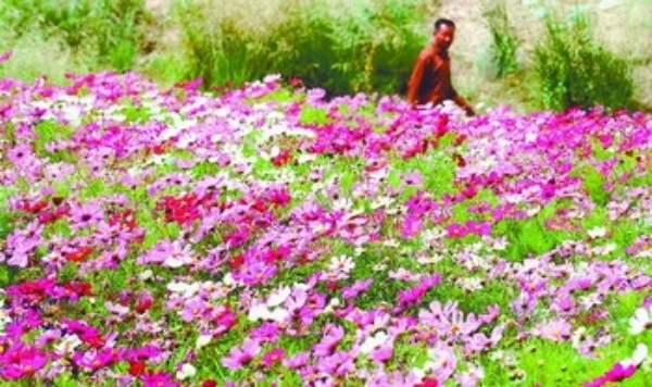 地处河西走廊的张掖市高台县新坝乡官沟村农民种植的用于制种的波斯菊(8月6日摄)。甘肃省利用河西走廊地区的自然条件优势,积极推进制种产业促进农民增收。2007年,全省农作物种子生产面积达311万亩,产值超过30亿元。 新华社记者 韩传号摄