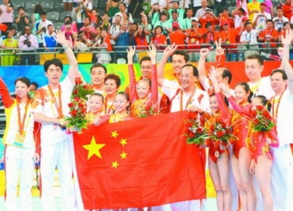 本报北京8月13日讯 记者郑杨报道:在今天进行的北京奥运会体操女子团体比赛中,中国队以188.900分获得中国体操史上第一个女团奥运金牌。美国队以186.525分获得银牌。罗马尼亚队以181.525分获得铜牌。 上图 中国体操女队队员与队友、教练一同庆祝。 本报记者 李景录摄