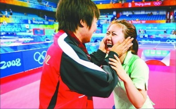 | 8月14日,日本队选手福原爱(右)赛后和队友庆祝胜利。在北京奥运会乒乓球女子团体项目小组赛第二轮比赛中,日本队经过艰难苦战以3比2战胜西班牙队。