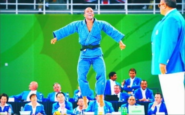 | 8月13日,瑞士选手谢尔盖·阿什万登(左)夺得奥运会男子柔道90公斤级铜牌后兴奋地跳起来。