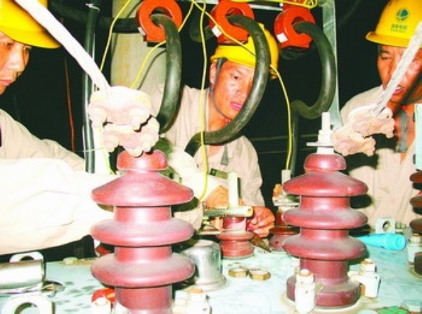 福建省长汀县对城区主要供电设备、线路实施“零点检修”,消除电网设备安全隐患,深受群众的好评。图为8月12日凌晨供电公司技术人员在检修供电线路。