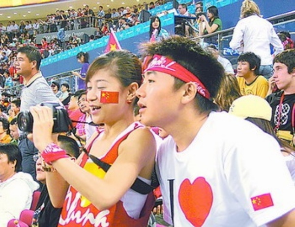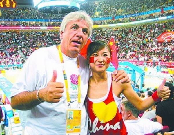忙碌的外国记者在工作之余邀请中国球迷在北京五棵松篮球馆留影。