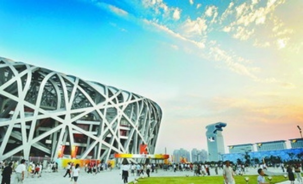在蓝天白云的映衬下,“鸟巢”显得更加神奇美丽,富有现代气息。