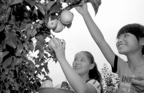 目前,江西省鄱阳县田畈街镇发扬村铁耙顶的2000多亩翠冠梨正陆续上市并销往广东、福建等沿海地区。从2002年底开始,鄱阳县田畈街镇发扬村利用铁耙顶荒山发展林果业,统一规划种植、统一生产技术、统一品牌销售,并进行分户管理、分类指导,带动了当地400多农户生产致富。图为8月1日,鄱阳县田畈街镇发扬村的村民在采摘翠冠梨。
