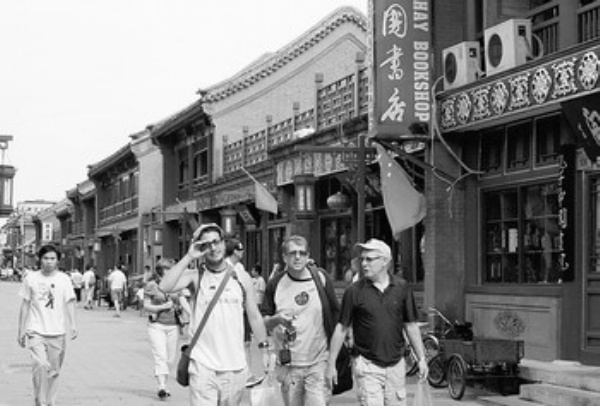 8月16日,几位外国游客在北京琉璃厂文化街游览购物。随着北京奥运会的举行,越来越多的中外游客前来看奥运游北京,人们在观看奥运赛事的同时休闲购物,北京前门大街、秀水街、琉璃厂文化街等特色商业街区人来人往,生意红火。