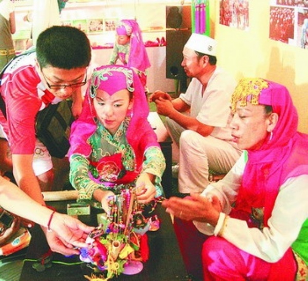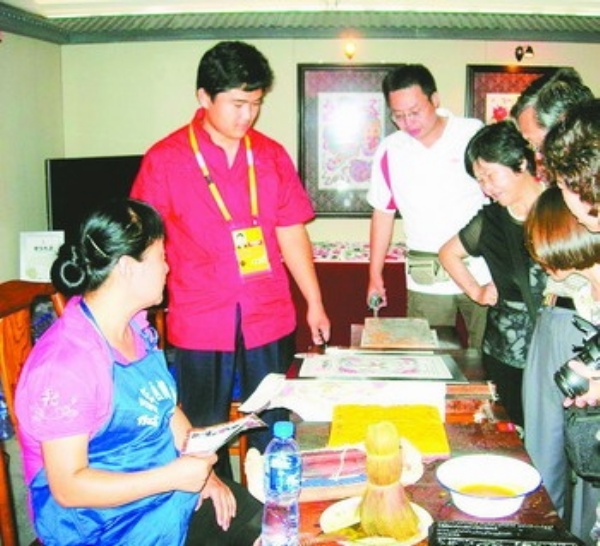 在宁夏“祥云小屋”,游客正详细询问绣包的制作过程。 本报记者 杨忠阳摄