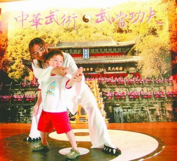 在湖北“祥云小屋”,武术表演者正向一位小朋友指导武当功夫的招式。