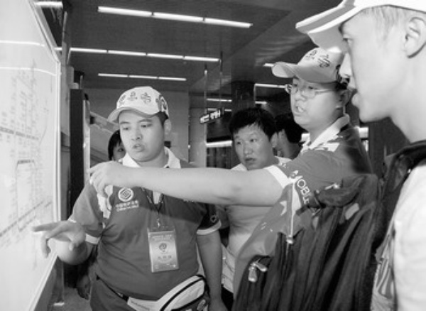 8月19日,在北京地铁雍和宫站,几名志愿者在为乘客指路。据悉,北京奥运会期间,近2万名来自地铁公司和28所高校的志愿者,在地铁8条线路提供包括线路指引、秩序维护等服务。 贺长山摄 (新华社发)