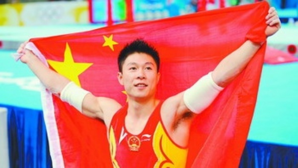 8月19日,中国选手李小鹏夺冠后高举五星红旗庆祝。当日,中国选手李小鹏在国家体育馆进行的北京奥运会体操男子双杠决赛中以16.450分的成绩夺得冠军。 新华社记者 程 敏摄
