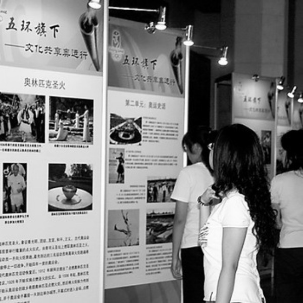 “文化共享奥运行”是全国文化共享工程管理中心经过精心筹划和部署,配合北京奥运开展的系列公益宣传服务活动之一。本次展览以图文并茂的形式介绍了奥运会起源、标志、会徽、圣火、历史等奥运知识,展出第一天,就吸引了不少到国家图书馆借阅的读者。读者们安静有序地围着30幅展板逐一阅览。