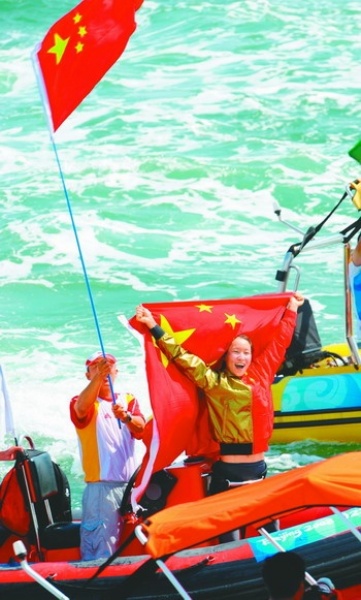 8月20日,中国选手殷剑比赛结束后身披国旗向观众致意。当日,北京奥运会女子帆板奖牌轮比赛在青岛举行,中国选手殷剑获得冠军,意大利选手达历山德拉·森西尼获得亚军,英国选手布里妮·肖获得季军。 新华社记者 范长国摄