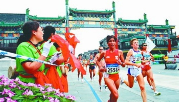 崭新的北京和热情的市民,使北京奥运会洋溢着喜庆热烈的气氛。图为参加北京奥运会女子马拉松比赛的运动员们,从修葺一新的前门大街经过时,沿途受到人们热情的欢迎,观众挥舞着旗帜为她们加油助威。