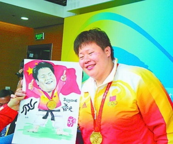 在最后关头反败为胜,夺得女子柔道78公斤以上级冠军后,佟文拿着观众送上的漫画像,笑眯了眼。