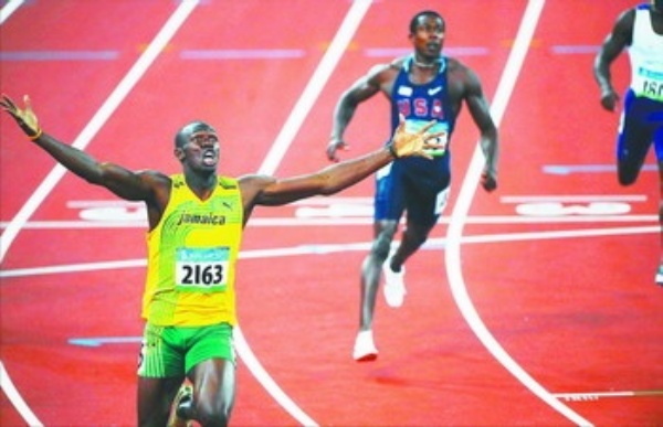 | 8月20日,牙买加选手博尔特(前)获胜后欢呼。当日,博尔特在北京奥运会男子200米决赛中,以19秒30的成绩夺冠并打破世界纪录。 本报记者 李景录摄 |