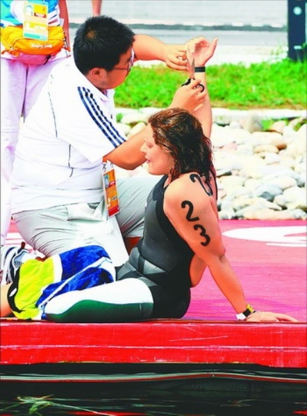 | 右图 8月20日,获得女子10公里马拉松游泳第16名的南非残疾人选手纳塔莉·杜托伊特(右)在比赛结束后休息。杜托伊特原是一位游泳健将,2001年2月,她在一次摩托车事故中失去了左小腿。此后,杜托伊特克服困难继续苦练游泳,在雅典残奥会上获得5枚金牌。纳塔莉·杜托伊特还是唯一取得参加北京奥运会和北京残奥会两个运动会的选手。 新华社记 |