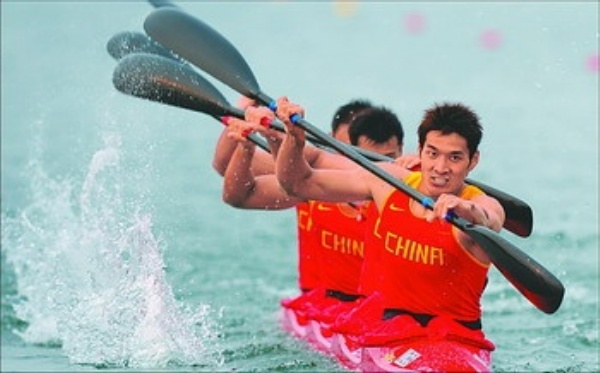| 8月20日,在顺义奥林匹克水上公园举行的北京奥运会男子四人皮艇1000米半决赛中,中国选手李臻、刘海涛、周鹏和林淼(从前至后)以3分01秒787的成绩获得第2名,晋级决赛。