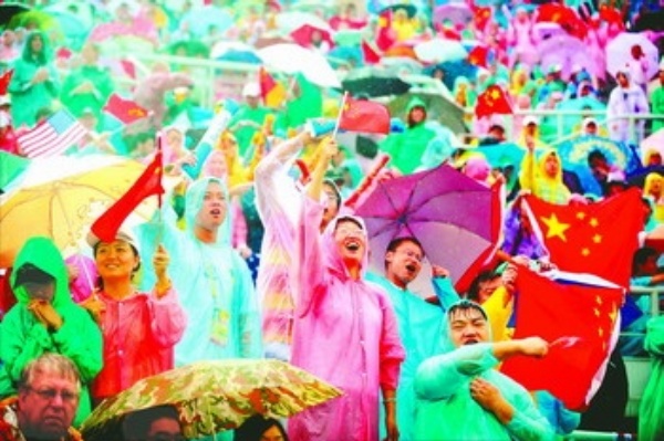 | 8月21日,北京奥运会女子沙滩排球比赛决赛在雨中进行。虽然雨越下越大,但看台上座无虚席,观众自始至终热情地为运动员们加油。