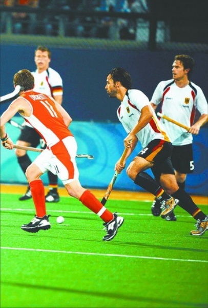 | 左图 8月21日,奥林匹克公园曲棍球场。当日,男子曲棍球半决赛在这里举行,荷兰队对阵德国队。