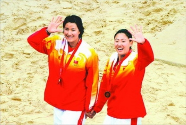 | 上图 8月21日上午,中国选手薛晨/张希在北京奥运会女子沙滩排球铜牌争夺战中获胜。