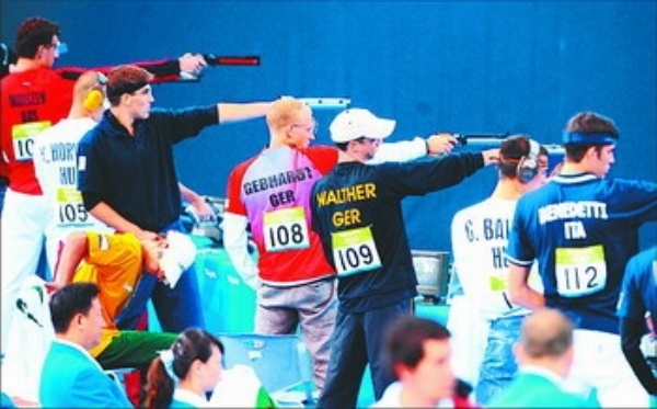 | 8月21日,北京奥运会现代五项比赛开赛,这是参赛选手在男子10米气手枪比赛中。