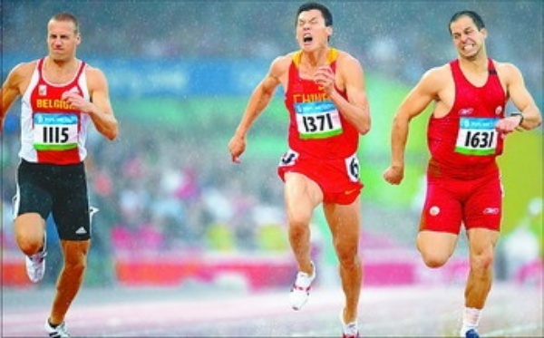 | 8月21日,中国选手齐海峰(中)在男子十项全能100米比赛中。齐海峰以11秒15的成绩名列小组第二。当日,北京奥运会田径比赛在国家体育场“鸟巢”继续进行。