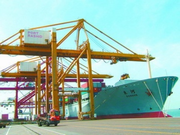 迪拜是海湾地区的重要贸易枢纽港口城市,并正在转型为西亚北非地区的物流中心。发展远洋运输是迪拜发展物流中心的重要一环,图为我国的东河号集装箱轮船停靠在迪拜的拉希德港口进行货物装卸。 徐惠喜摄