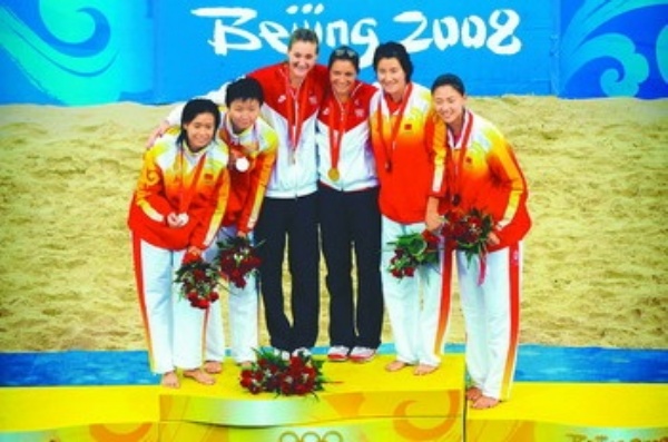 北京奥运会女子沙滩排球比赛21日进行了两场奖牌之战。两对闯入四强的中国组合一胜一负,获得1枚银牌和1枚铜牌。