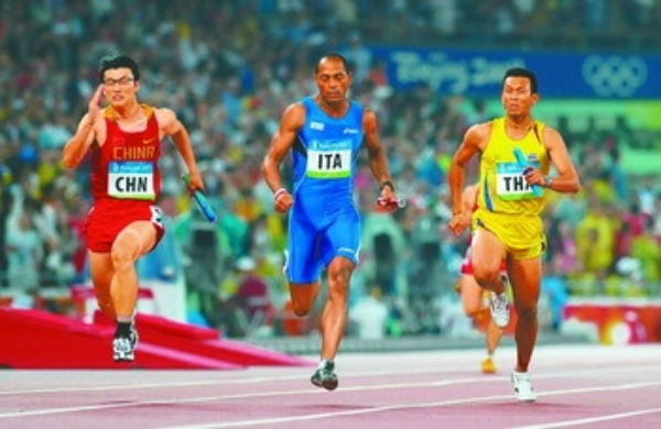 右图 8月21日,中国队选手胡凯(左)在比赛中。当日,中国队在北京奥运会男子4×100米接力第一轮比赛中以小组第四名的成绩晋级决赛。 新华社记者 郭大岳摄