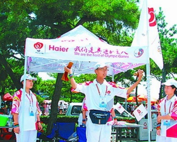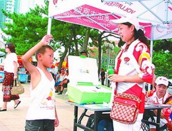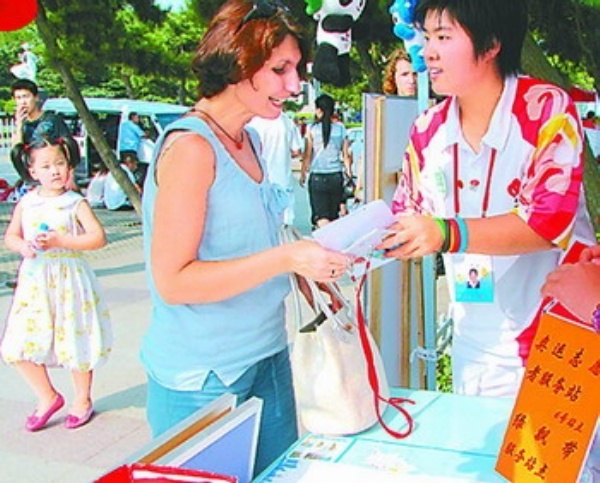 青岛栈桥的奥帆赛志愿者正在为外国游客提供服务。本报记者 刘 成摄