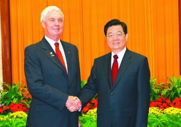 8月22日,国家主席胡锦涛在人民大会堂会见前来出席北京奥运会闭幕式及相关活动的澳大利亚总督杰弗里。 新华社记者 刘卫兵摄