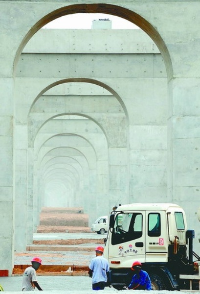 8月21日,桥梁工程人员在进行施工。近日,郑州黄河公铁两用特大桥工程开始进入桥面施工阶段。工程计划于2010年完工。 新华社记者 朱 祥摄