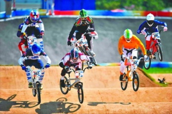 | 8月22日,北京奥运会自行车小轮车男子竞速决赛在老山小轮车赛场举行,拉脱维亚选手马里斯·斯特龙贝格斯(右四)率先冲过终点,夺得金牌。 新华社记者 梁 强摄 |