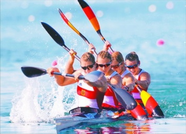 | 上图 8月22日,德国队在比赛中。她们在北京奥运会皮划艇静水项目女子四人皮艇500米决赛中以1分32秒231的成绩获得冠军。 新华社记者 申 宏摄 |