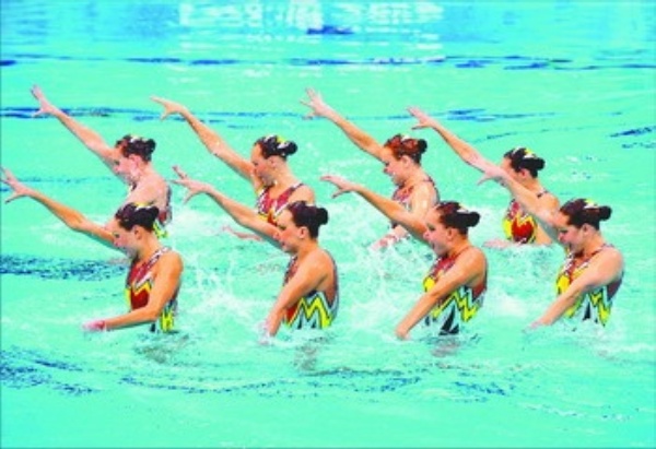 | 下图 8月22日,北京奥运会花样游泳女子团体赛集体技术自选在国家游泳中心进行,俄罗斯队以49.500分居首位。