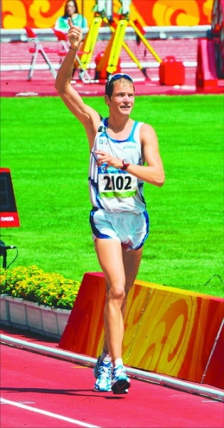 | 下图 8月22日,北京奥运会男子50公里竞走比赛中,意大利选手施瓦策以3小时37分09秒的成绩获得金牌,这一成绩也打破了奥运会纪录。 本报记者 李景录摄 |