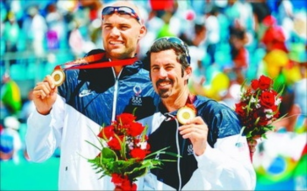 | 8月22日,在北京奥运会沙滩排球男子决赛中,美国选手菲利普·达尔豪瑟/托德·罗杰斯以2比1战胜巴西选手,获得冠军。