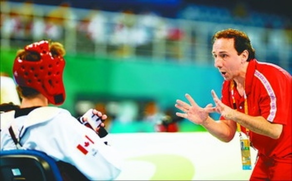 | 8月22日,北京奥运会跆拳道男子80公斤级四分之一决赛间隙,加拿大选手米肖的教练对他进行指导。 新华社记者 王毓国摄 |