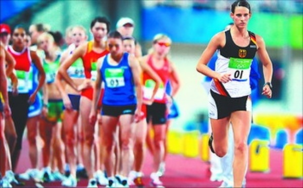 | 8月22日,德国选手莱娜·舍内博恩在北京奥运会女子现代五项比赛中,获得冠军。这是她在3000米越野跑比赛中出发。