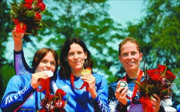 | 8月22日,在北京奥运会女子小轮车竞速决赛中,法国选手安妮—卡罗琳·肖松(中)、法国选手拉埃蒂蒂娅·科尔吉耶(左)和美国选手吉尔·金特纳分别获得金银铜牌。