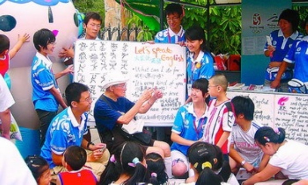 北京市宣武区陶然亭公园城市志愿者服务站点,94岁高龄的老人李书成为来公园游玩的小学生们教授英语。李书成老人退休前是北京第二外国语学院英语系教师,在晨练中看到志愿者们积极为游人提供帮助,老人也主动要求加入到志愿者行列中。