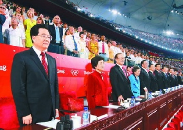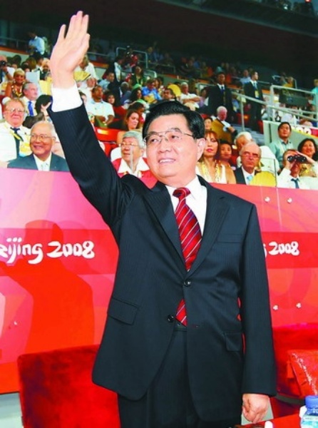 在欢快的乐曲声中,胡锦涛、江泽民和罗格等走上主席台,向观众挥手致意。全场响起热烈的掌声。