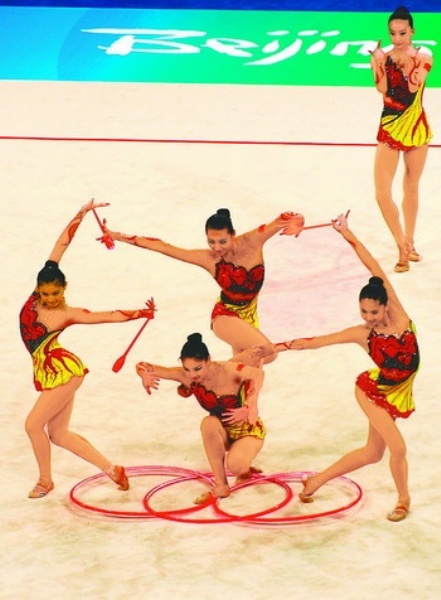 8月24日,在北京工业大学体育馆举行的北京奥运会艺术体操集体全能决赛中,中国队获得亚军。 本报记者 李景录摄