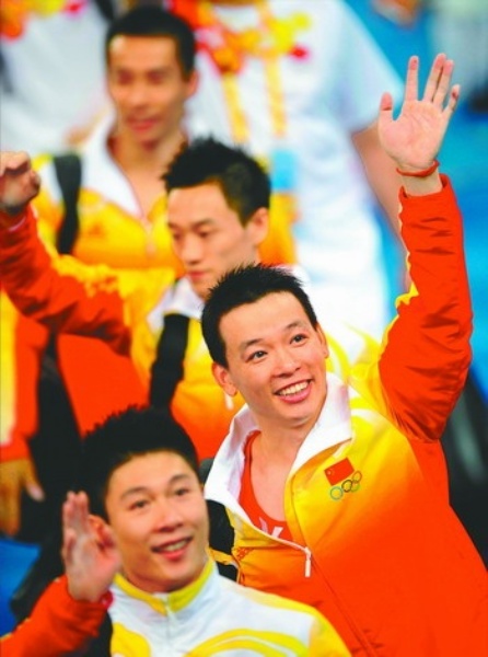 8月12日,中国男子体操队队员在北京奥运会体操男子团体决赛中夺冠后向观众致意。 新华社发