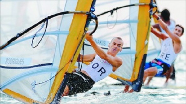 8月15日,葡萄牙选手若昂·罗德里格斯(前)在比赛中奋力争先。 新华社记者 宋振平摄