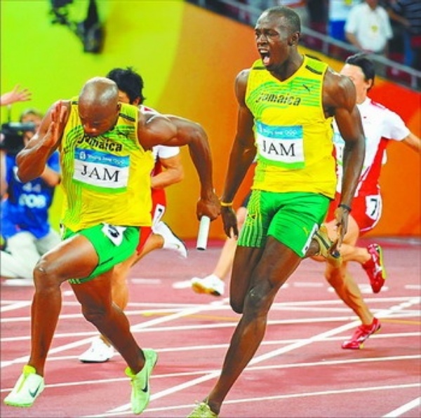 | 8月22日,牙买加队选手阿萨法·鲍威尔(前左)在北京奥运会男子4×100米接力决赛中与队友尤塞恩·博尔特(前右)交接。 新华社记者 焦卫平摄 |